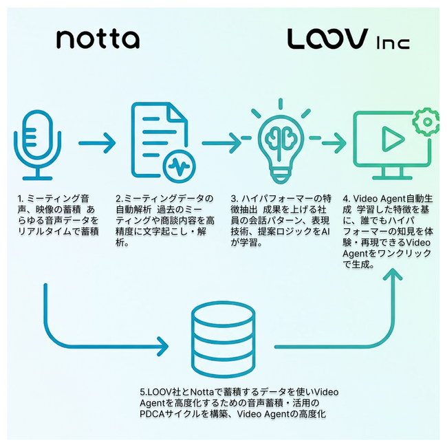 このような背景を踏まえ、NottaとLOOVはそれぞれの強みを融合し、営業支援とVideo Agentを組み合わせた新しいソリューションの共同開発に着手いたしました。