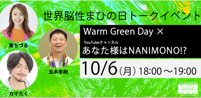 10月6日は「世界脳性まひの日~Warm Green Day~」「あなた様はNANIMONO!?」とコラボ!東ちづる×カマたく×玉木幸則の 台本も忖度もないぶっちゃけトークを生配信!会場参加も大募集!