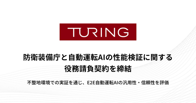 Turing株式会社(本社:東京都品川区、代表取締役:山本 一成、以下「チューリング」)は、防衛装備庁陸上装備研究所と「一貫型自律走行技術の検証」の役務請負契約を締結したことをお知らせします。当社は本契約のもと、乗用車向け自動運転の研究開発で培った成果を基盤に、未舗装路を含む不整地環境における一貫型自律走行技術(End-to-End、以下「E2E」)の性能を検証します。