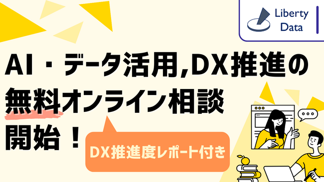 あらゆるデータの資産化とデータ駆動型経営の実現に向けたサービスを提供するLiberty Dataは、AI・データ活用、DX推進の様々なお悩みを解決するため、HPに「無料オンライン相談」のページを新たに開設いたしました。DX推進時に直面する初期段階のお悩みから、業界領域に特化したお悩みまで当社コンサルタントが対応し、ご相談後には貴社のDX推進度レポートを送付いたします。
