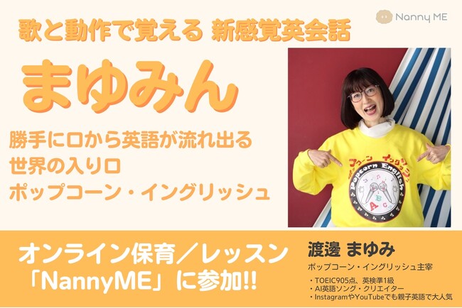 オンライン保育/レッスン「NannyME」(運営:株式会社七色、代表取締役CEO:佐々木綾香)は、歌って踊るオンライン英会話コーチ・AI英語ソングクリエイターとして親子から大人気の「まゆみん」先生を、英語レッスンのNanny(講師)として新たに迎えました。