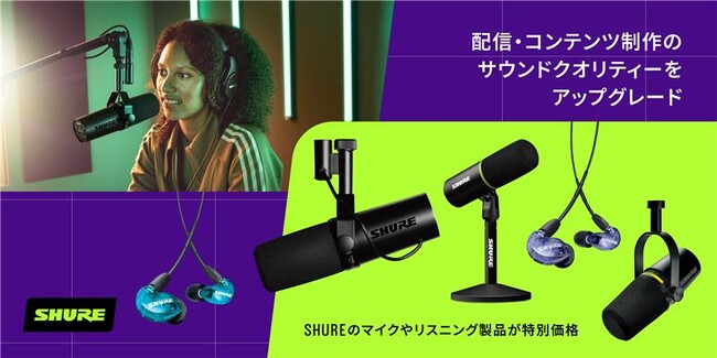 今回の「プライム感謝祭」では、配信用マイクの最高峰と評価されるプリアンプ搭載ボーカルマイクロホン『SM7dB』や、USB-C/XLRハイブリッド出力マイクロホンの『MV7+』、インイヤーモニターやゲーミング用途でも圧倒的に支持され続ける高遮音性イヤホン『SE215』、そしてDSPで音質を自由にコントロールできるストリーマー向けマイクロホンの『MV6』など、コンテンツ制作や配信、モニタリングに適した多彩な製品ラインアップをご用意し、Shureの人気製品をお得にお買い求めいただける機会となります。