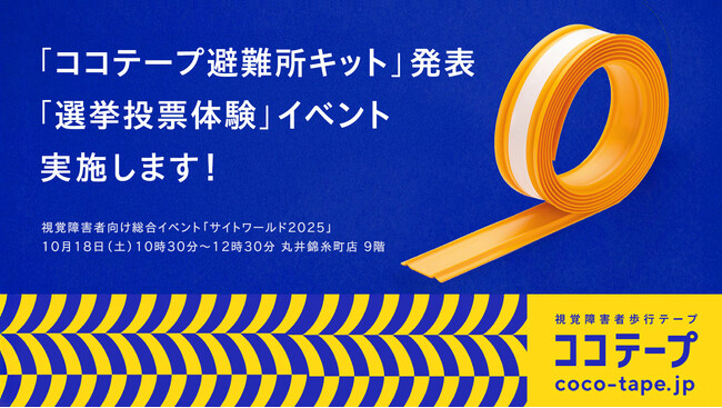 最終日の10月18日(土)には、視覚障害者歩行テープ「ココテープ」の新たな活用事例を紹介するイベントを開催し、「ココテープ避難所キット」の発表、「選挙投票所での活用事例」紹介、さらに模擬投票所での投票体験を実施します。