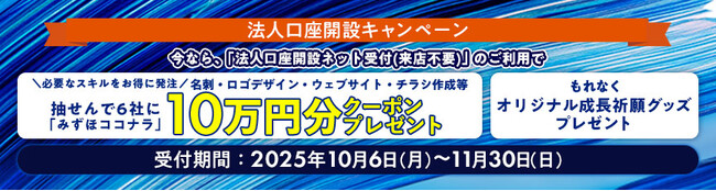 ・法人口座開設月の翌々月末時点で10万円以上の口座残高があったお客さまの中から、抽せんで6社に、会社のロゴ制作やウェブサイト作成など幅広いジャンルで使える「みずほココナラクーポン10万円分」をプレゼント