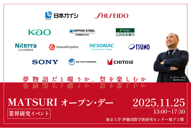 バイオエコノミーを推進する産業横断型の共創イニシアチブ「MATSURI」を運営するちとせグループは、2025年11月25日(火)に業界研究イベント「MATSURIオープン・デー in 東京大学」を開催いたします。地球規模の課題解決と持続可能な経済成長のためには、技術や研究内容の事業化にとどまらず、その先の産業化まで見据える必要があります。本イベントには、その最前線を牽引する企業が多数出展し、参加者が自らの学びを社会に実装していくための新しいキャリアの可能性を提示します。また、産業界や学術界それぞれの視点を交えた講演を通じ、未来社会を支えるバイオエコノミーについて多角的に学ぶことができます。