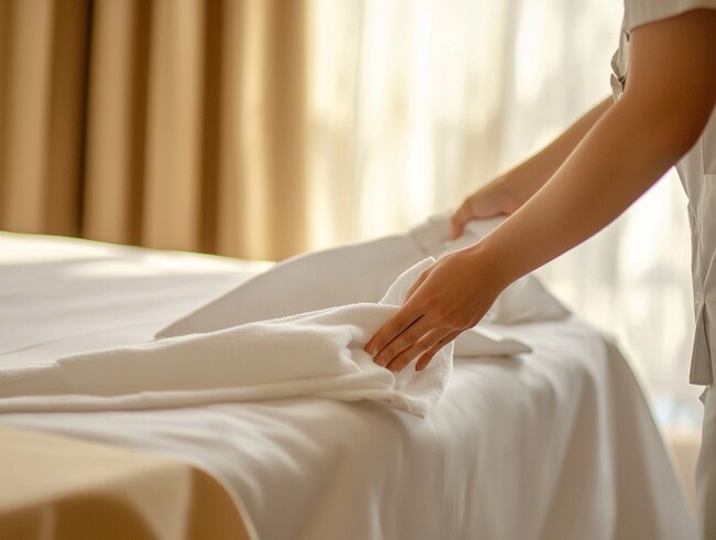 リネン品質の均一化 : ホテル仕様のリネン業者から直接仕入れた純白タオルやプレスライン入りシーツを使用し、資材の管理や汚れチェックを徹底します。