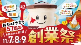 とんでん株式会社(本店所在地:北海道恵庭市、代表取締役社長:駒場雅志)は、「北海道生まれ和食処とんでん」北海道・関東全店舗にて、創業57周年を記念して、2025年11月7日(金)~9日(日)までの3日間、年に1度の『創業祭』を開催いたします。限定メニュー「ジャンボ北海道牛乳ソフト」の販売や人気メニューを特別価格でご用意するほか、川柳コンテストやプレゼントキャンペーンなど、多数のイベントを実施いたします。