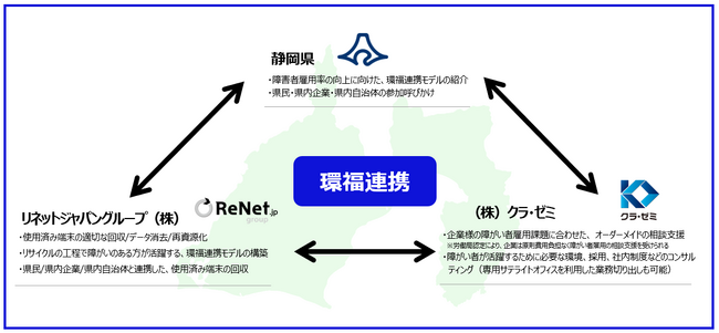 「県民・企業・自治体の使用済みパソコンの適正処分(都市鉱山の掘り起こし) 」と、「そのリサイクルに県内在住の障がい者が参画できる仕組み」を掛け合わせることで、資源の有効活用と障がい者雇用を企業規模に関わらずに叶えるのが、環福連携モデルです。静岡県が障がい者雇用率向上に向けた啓発活動、リネットジャパンが環境分野、クラ・ゼミが福祉分野を担うことで、地産地消型の環福連携を実現します。[画像2: https://prcdn.freetls.fastly.net/release_image/140158/3/140158-3-36b34cdc5862bb9d56e0d6d7a813a26b-1176x544.png?width=536&quality=85%2C75&format=jpeg&auto=webp&fit=bounds&bg-color=fff ]