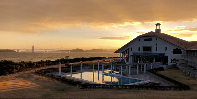 瀬戸内の穏やかな光に包まれたダイニングからは、夕日に染まる鳴門海峡の絶景を一望。