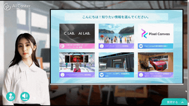 AI Casterは、最先端の生成AI技術を融合させた、次世代型情報発信サービスです。企業の広報・プロモーション活動の支援や、業務効率化をサポートし、これまでにない情報発信体験を提供します。PR・IR動画、マニュアル解説、社内研修、FAQ対応など、さまざまな情報を誰でも手軽に映像化できる革新的なツールとしてご活用いただけます。さらに、社内外の業務サポートにも応用できるため、広報やカスタマーサポート、教育領域など、さまざまなシーンでの業務効率化に貢献します。