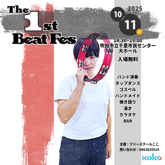 NPO法人ここ(事務所:大阪府吹田市、理事長:三科元明)は、2025年10月11日(土)に千里市民センター大ホール(大阪府吹田市津雲台1丁目2−1 2階)にて、音楽フェス「The 1st Beat Fes vol.4」を開催します。