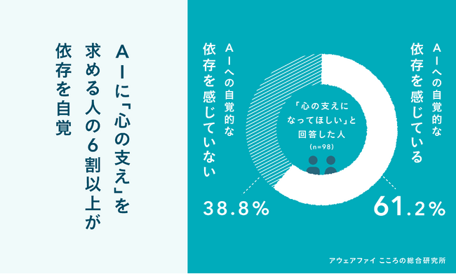 - 対話型生成AIに「心の支え」を求めていない人のうち、AIへの自覚的な依存を感じている人は23.37%(172名/736名)- 一方、AIに「心の支え」を求めている人では、61.22%(60名/98名)が自覚的な依存を感じている