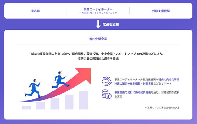 本事業では、都内経済の成長を牽引し、さらなる飛躍を目指す中堅企業を対象に、事業の計画策定、事業の実現に向けた体制構築や計画実行を支援します。また、事業の実行に向けて取り組む、人材育成、研究開発に必要な機械設備投資、中小企業やスタートアップとの連携(オープンイノベーションやM&Aなど)に必要な経費についても併せて支援します。