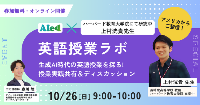 英語教育分野でテクノロジーを活用したソリューションを展開するアイード株式会社(本社:東京都新宿区、代表取締役:窪田優希、以下「アイード」)は、ハーバード教育大学院在学中の上村洸貴先生(長崎北高校教諭)とともに、生成AIを活用した授業実践を共有・議論し、英語教育の新たな可能性を探るオンライン交流イベント「英語授業ラボ」を開催します。