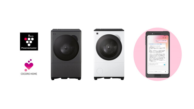 左から、プラズマクラスタードラム式洗濯乾燥機<ES-8XS1-H(グレイングレー)/-W(ラスターホワイト)>、「COCORO HOME AI」トーク画面イメージ