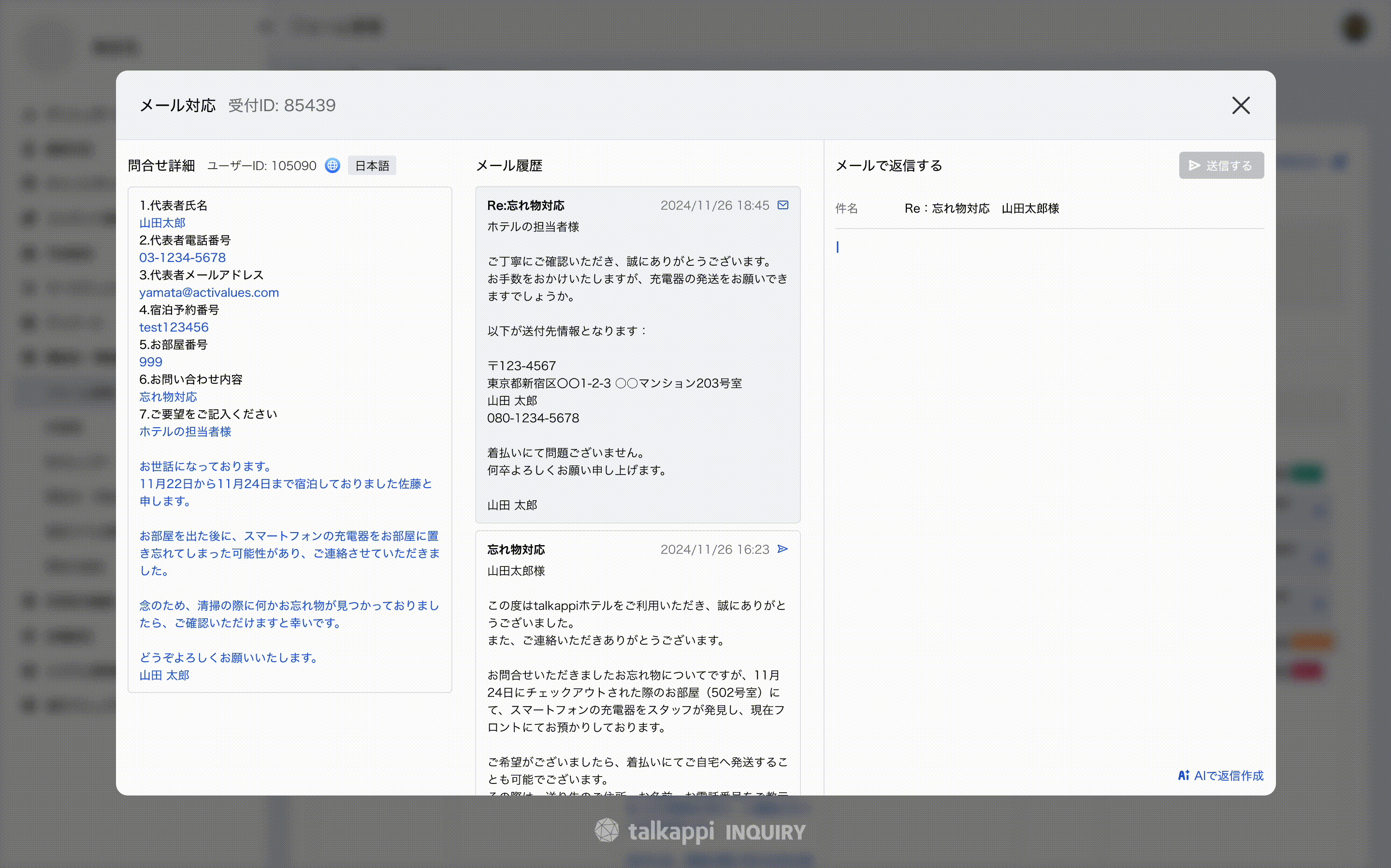 こうした中、talkappiはもともと施設の案内情報やFAQを一元管理しており、常に最新の情報を保持しています。加えて、問合せ・受付フォーム「talkappi INQUIRY」で受付の自動化を実現し、先日リリースした「メール連絡の記録・管理機能」により、やり取り履歴も自動的に蓄積できるようになりました。