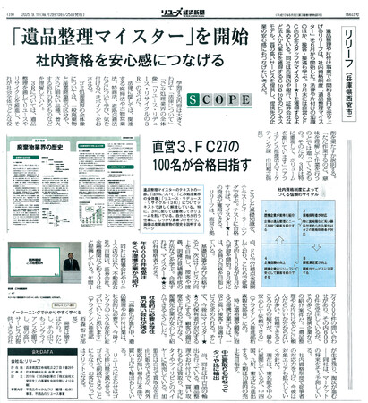 遺品整理や家財のリユース事業を展開する株式会社リリーフ(本社:兵庫県西宮市、代表取締役:赤澤知宣)は、6月からスタートした当社独自の社内資格制度『遺品整理マイスター』を全社員(FC加盟店含む)が合格し資格を取得しました。また本取り組みが2025年9月10日発行の「リユース経済新聞」に掲載されたことをお知らせいたします。記事では、本制度がサービス品質向上だけでなく、提携企業の安心感にも繋がるビジネスモデルとして評価されました。
