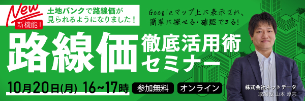[画像3: https://prcdn.freetls.fastly.net/release_image/102219/19/102219-19-f0e760dd2d342ea3f257ae78a992afe8-600x200.jpg?width=536&quality=85%2C75&format=jpeg&auto=webp&fit=bounds&bg-color=fff ]土地バンクでは「路線価表示機能」の公開に合わせて、この新機能の使い方について、【10月20日(月)16時~17時】に、オンラインにて無料セミナーを実施させていただきます。