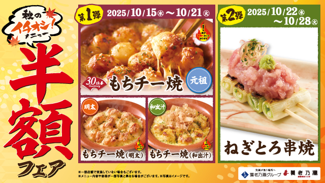 養老乃瀧株式会社(東京都豊島区、代表取締役 矢満田 敏之)は、「養老乃瀧」において行われる2025年10月15日(水)のメニュー改定に伴い、『秋のイチオシメニュー半額フェア』を開催いたします。本フェアでは、対象の新メニューについて、期間中、通常価格の半額で提供いたします。