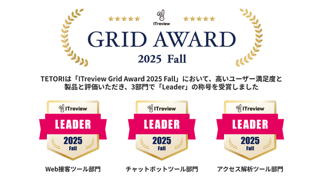 このたび、Web接客ツール「TETORI(テトリ)」は、「ITreview Grid Award 2025 Fall」において、「Web接客ツール部門」、「チャットボットツール部門」、「アクセス解析ツール部門」 の3部門で、高い顧客満足度と認知度を兼ね備えた製品として評価され、「Leader」称号を受賞いたしました。