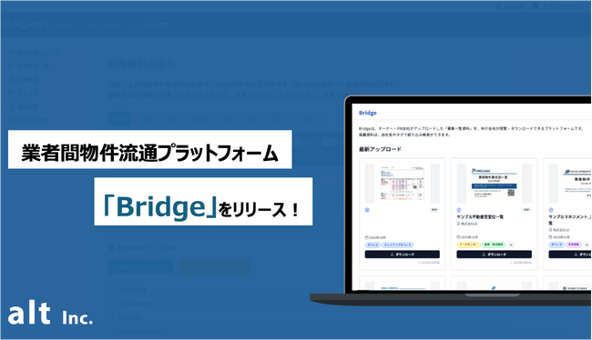 株式会社alt(本社:東京都渋谷区、代表取締役:石原一樹)は、不動産デベロッパーやプロパティマネジメント会社が自社の募集一覧を効率的に共有できる業者間物件流通プラットフォーム「Bridge(ブリッジ)」をリリースしました。