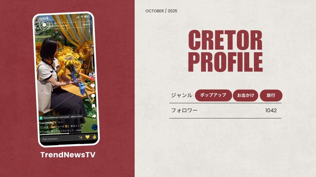 「TrendNewsTV」は、企業やブランドのポップアップイベントをはじめ、話題のホテルなどを中心に取材し、動画を制作・発信しています。これまでの投稿の中には、再生回数3万回を超える動画も。ポップアップ・おでかけ・旅行分野に強みを持つ同メディアの加盟により、SNS上でのイベント認知や集客の効果がさらに期待できます。