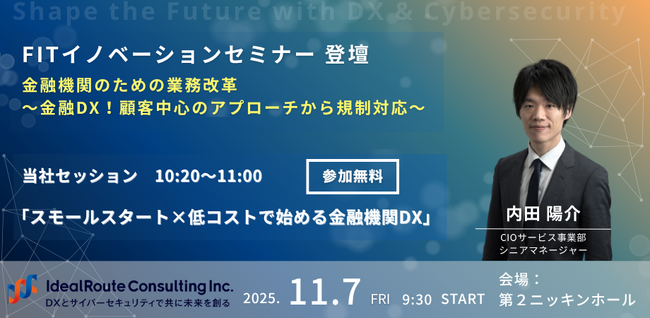 アイディルートコンサルティング株式会社(本社:東京都千代田区、代表取締役社⾧:石川 耕、以下:当社) は、2025年11月7日(金)に開催される金融機関向けセミナー「金融機関のための業務改革 ~金融DX!顧客中心のアプローチから規制対応~」(主催:日本金融通信社〈ニッキン〉)に登壇いたします。