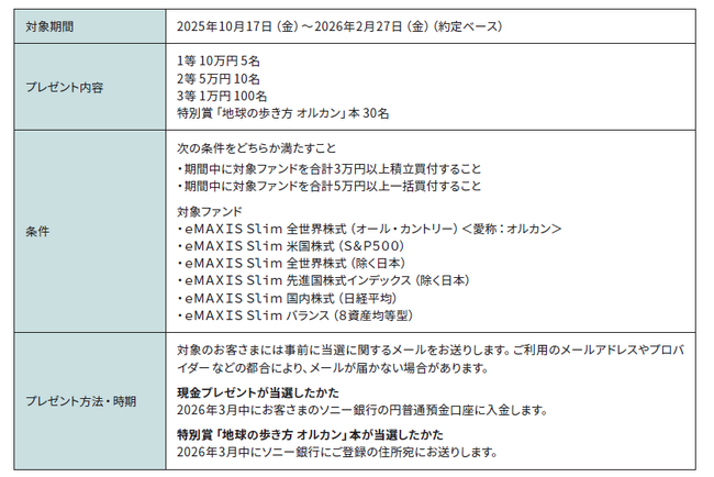 ソニー銀行株式会社(代表取締役社長:南 啓二/本社:東京都千代田区/以下 ソニー銀行)は、2025年10月17日(金)より、「eMAXIS Slimシリーズの購入で最大10万円プレゼント!」キャンペーンを実施しますので、お知らせします。