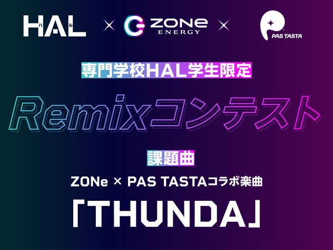 IT・デジタルコンテンツ業界の各分野で活躍するスペシャリストを育成する専門学校HAL(東京・大阪・名古屋)は、エナジードリンクブランド「ZONe ENERGY」と、話題の音楽ユニットPAS TASTAがコラボレーションした楽曲「THUNDA」を題材に、学生限定のRemixコンテストを開催いたしました。未来の音楽シーンを担う若き才能を讃える3つの賞――「大賞」「ZONe ENERGY賞」「PAS TASTA賞」が決定しましたのでお知らせいたします。
