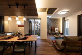旗竿敷地が建物に囲われ、南側からの採光が難しく、視線が抜けず圧迫感が生じる課題を克服するため、従来の一般的な間取りとは異なる配置計画を採用した分譲住宅です。建物に光を取り込むため、水廻りを南側に配置し、家の中心に光を呼び込む中庭を設けました。中庭に植えられたシンボルツリーは、屋内にいながら常に緑を感じさせてくれます。また、玄関と中庭に同じタイルを使用することで、内と外の境界を曖昧にし、開放感を演出。リビングからは中庭と玄関が一望でき、自然と一体となる広々とした空間を実現しています。