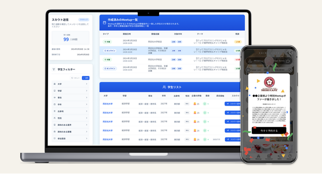 Meetup(少人数交流会)を開催したい企業が、学生を招待することができるサービスです。招待された学生の反応を確認できる機能も整い、今般、サービスを開始しましたのでお知らせいたします。