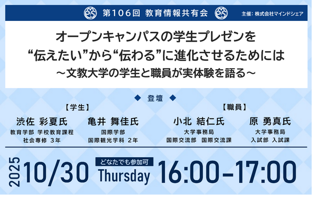 【教育機関の方限定:無料】10月30日(木)第106回教育情報共有会「オープンキャンパスの学生プレゼンを“伝えたい”から“伝わる”に進化させるためには~文教大学の学生と職員が実体験を語る~」
