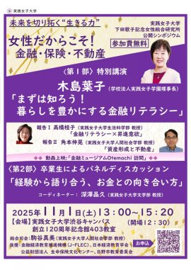 実践女子大学下田歌子記念女性総合研究所(所長:高橋桂子・生活科学部教授)は11月1日(土)に渋谷キャンパスで、公開シンポジウム「女性だからこそ!金融・保険・不動産」を開催します。近年注目を集める「金融リテラシー」をテーマに掲げ、大学生を中心に、自ら考え・判断し、社会と主体的に関わる力を育むことを目的としています。講演や卒業生によるパネルディスカッションを通じて、金融にあまり関心がない人を含め、来場者が「暮らしとお金」の多様な関わりを知り、自分らしい人生を選択するためのヒントや気づきを提供します。