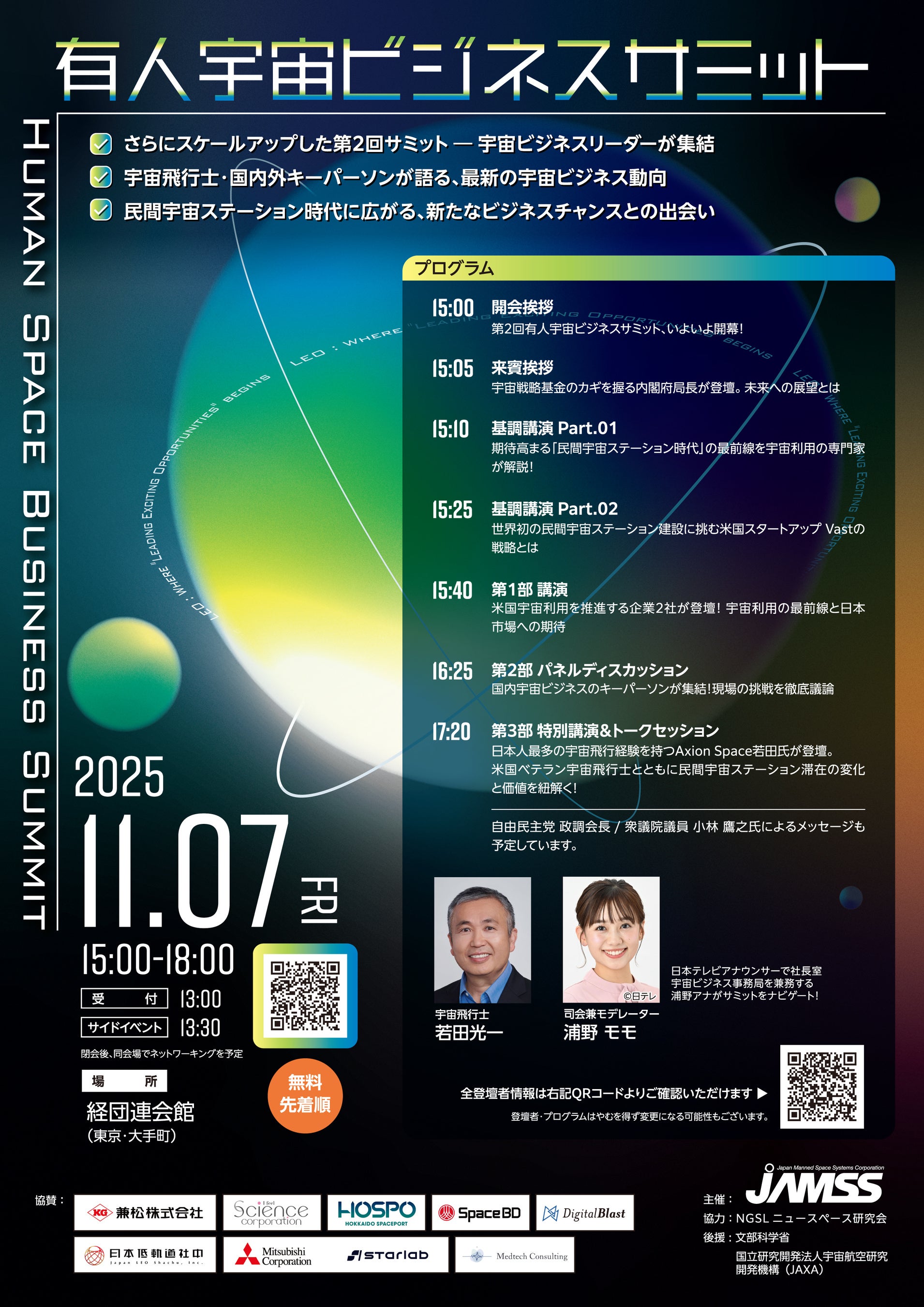 有人宇宙システム株式会社(本社:東京都千代田区 代表取締役社長:有賀 輝)は、2025年11月7日(金)に「第2回有人宇宙ビジネスサミット」を開催いたします。