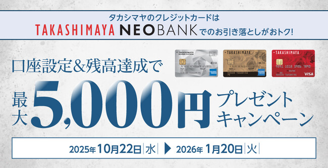 株式会社高島屋と連結子会社である高島屋ファイナンシャル・パートナーズ株式会社、及び住信SBIネット銀行株式会社は、より多くのお客様に高島屋ネオバンク、及びタカシマヤのカードをご利用いただくため、「タカシマヤのカードの口座設定等で最大5,000円プレゼントキャンペーン」を2025年10月22日(水)から実施します。