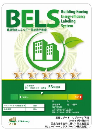 「BELS(Building-Housing Energy-efficiency Labeling System/建築物省エネルギー性能表示制度)」は、建築物の一次エネルギー消費性能を第三者機関が評価し、結果を表示する制度です。この制度の中で、基準建物と比較して一次エネルギー消費量を50%以上削減した建物が「ZEB Ready」として位置づけられます。リゾナーレ下関は、複数の省エネ技術を組み合わせることで、基準値に対して53%の一次エネルギー消費量削減を達成し、ホテル単一用途(10,000平方メートル 以上/新築)では、日本で初めて「ZEB Ready認証」を取得しました。