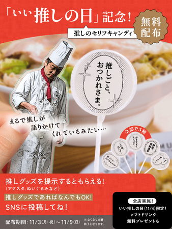 11月4日限定・全店にて、推し活グッズ提示でソフトドリンク一杯プレゼント!さらに、思わず撮りたくなる推しのセリフキャンディがもらえる店舗も!