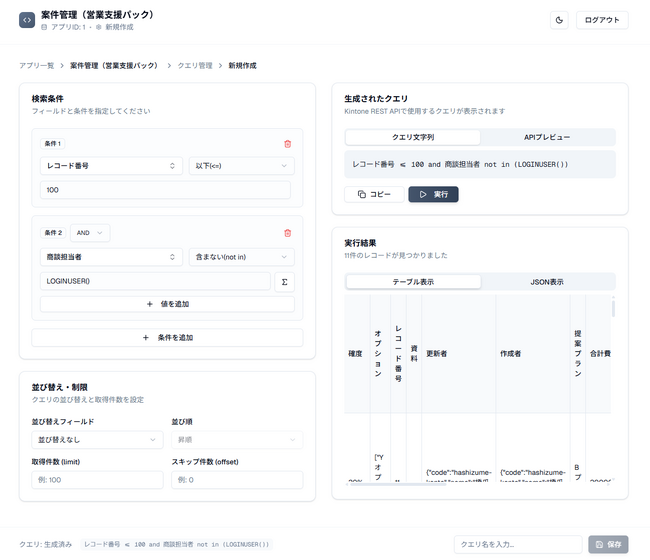 kintone API Query Creatorのクエリ設定画面