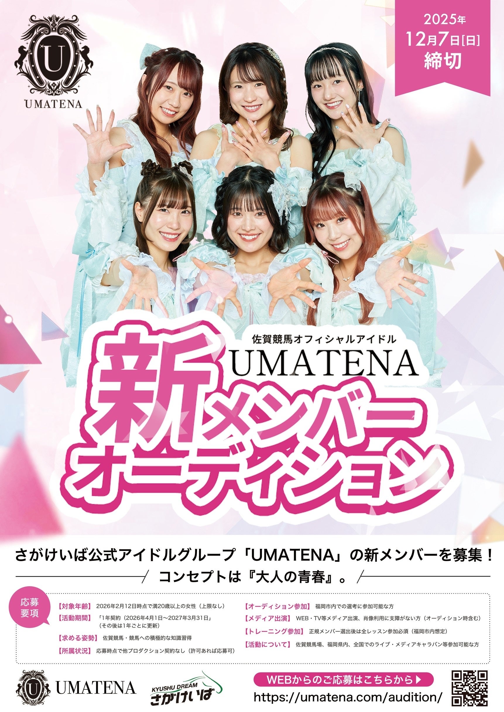 地方競馬場初のアイドルグループ「UMATENA」が、新たな仲間を迎えるべく、新メンバーオーディションを開催します。グループ名「UMATENA」は、“うまてなし(佐賀競馬のおもてなし)”と、ギリシャ神話の戦いの女神“アテナ”を掛け合わせています。「大人の青春」をコンセプトに、佐賀競馬の魅力を全国へ発信する広報大使として、ライブパフォーマンスやメディア出演、イベント出演など多彩な活動を展開しています。募集対象は20歳以上。「忘れていた青春」を取り戻したい、そんな想いを持つ方のご応募をお待ちしています。