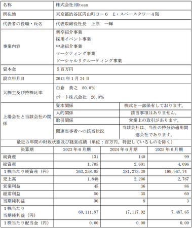 HRteam社とは、当社の新卒層の90%以上の会員基盤の積極活用、その後のクロスセル等による既卒、第二新卒の集客力強化によって、両社の更なる拡大及び収益増加が見込まれることから、2023年3月31日に資本業務提携を締結し、人材領域のアライアンスサービスにおける更なる連携強化と、HRteam社の今後の更なる成長を支えるためのコーポレート体制の強化の取り組みを行ってまいりました。資本業務提携後の取引関係も両社にとって良好な状況で、更なるシナジーの創出を目指し、2024年12月2日に当社がHRteam社の株式を追加取得(保有比率20.0%)し、当社の持分法適用関連会社となりました。