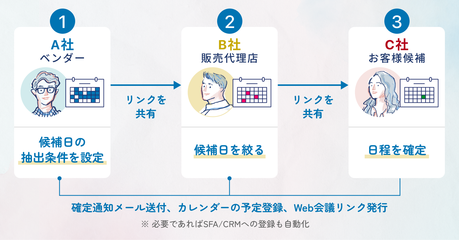 本機能は、絞り込み型空き時間リンクをパートナーに共有するとパートナーが候補日を絞り込み、絞り込まれた候補日から3人目の関係者(顧客など)が日程を確定することができる仕組みです。