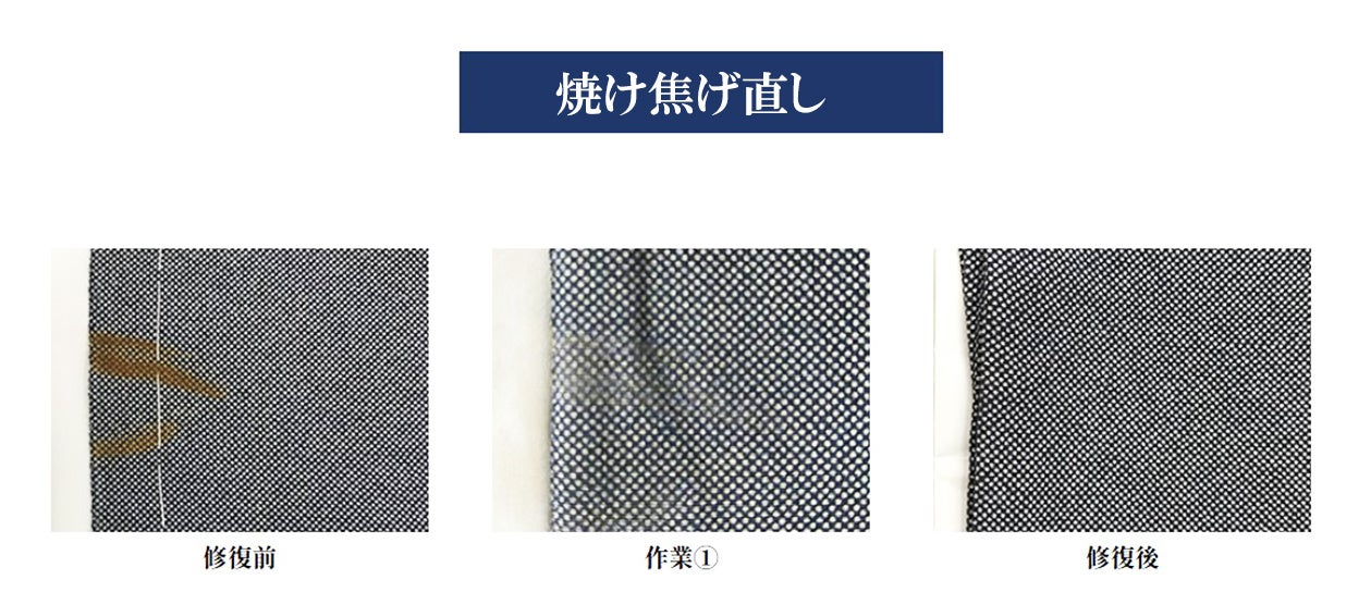 お客様の不注意で、ちょっとした瞬間に起こってしまった江戸小紋のアイロンの焦げを修復いたしました。最初の工程で生地表面の焦げ部分を取り除いた後、(作業1)漂白し、柄を描き入れました。