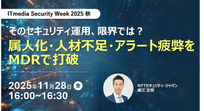 NTTセキュリティ・ジャパン株式会社(本社:東京都千代田区、代表取締役社長:関根 太郎、以下NTTセキュリティ・ジャパン)は、2025年11月25日(火)~12月1日(月)に開催される、ITmedia主催イベント「ITmedia Security Week 2025 秋」にて「マネージドセキュリティサービス」をテーマに講演を行います。