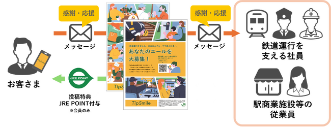 ポスター等に記載された二次元コードや、SNS等で配信されるURLから専用サイトにアクセスするだけの簡単な操作で、メッセージを投稿することができます。さらに「TipSmile」に会員登録のうえJRE POINTと連携していただくと、投稿特典としてJRE POINTを受け取ることができます。