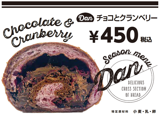 このたび新発売する『DAN』シリーズは、美しい断面とボリューム感のある具材が特徴のパンシリーズです。具材は、チョコとクランベリーやくるみレーズンなど、ベーカリーでよく見かけるバリエーションですが、2種類の生地を使用してパンをカットした時に断面が美しくなるよう製造工程にもこだわっています。“萌え断”という言葉とともにサンドイッチの断面が一時期トレンドになりましたが、パンの断面も芸術的。次なるパントレンドの予感です。