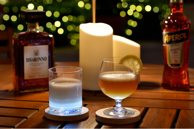「Alberobello(アルベロベッロ)」(画像:右)は、オレンジの甘さと香りにハーブのほろ苦さが絶妙なイタリアで人気のリキュール「アペロール」を使用したアペリティフに最適な一品です。イタリア南部の世界文化遺産に認定されるアルベロベッロの石造りの家が並ぶ美しい街の風景が本館中庭の趣と重なる、食前におすすめの色鮮やかな一杯です。