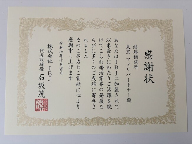 結婚相談所 東京フォリパートナー(本社:東京都、代表:守部弘昭)は、所属連盟「IBJ(株式会社IBJ)」より永年加盟に対する感謝状と記念品を授与されました。