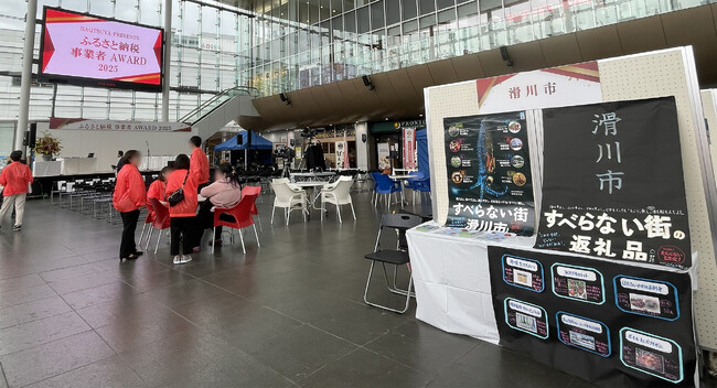 会場には、自治体のふるさと納税プロモーションブースや、エントリー事業者の返礼品の紹介や試食ブースもあり、多くの人が行き交う場所の雰囲気も含めて大雨にも負けず、活気がありました。滑川市はご担当者の愛情たっぷりの力作ブースを設営していただきました。