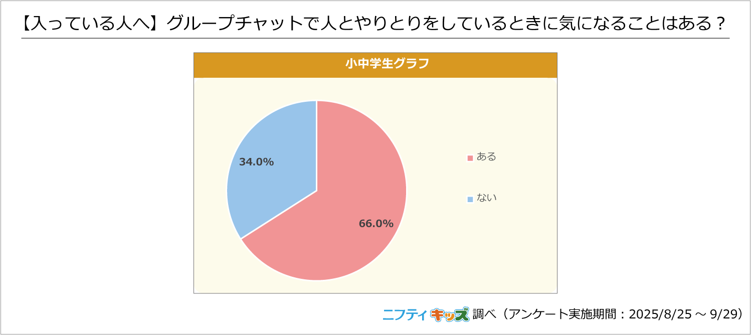 友だち同士のグループチャットに入っている小中学生のうち、66%が「ある」と回答しました。