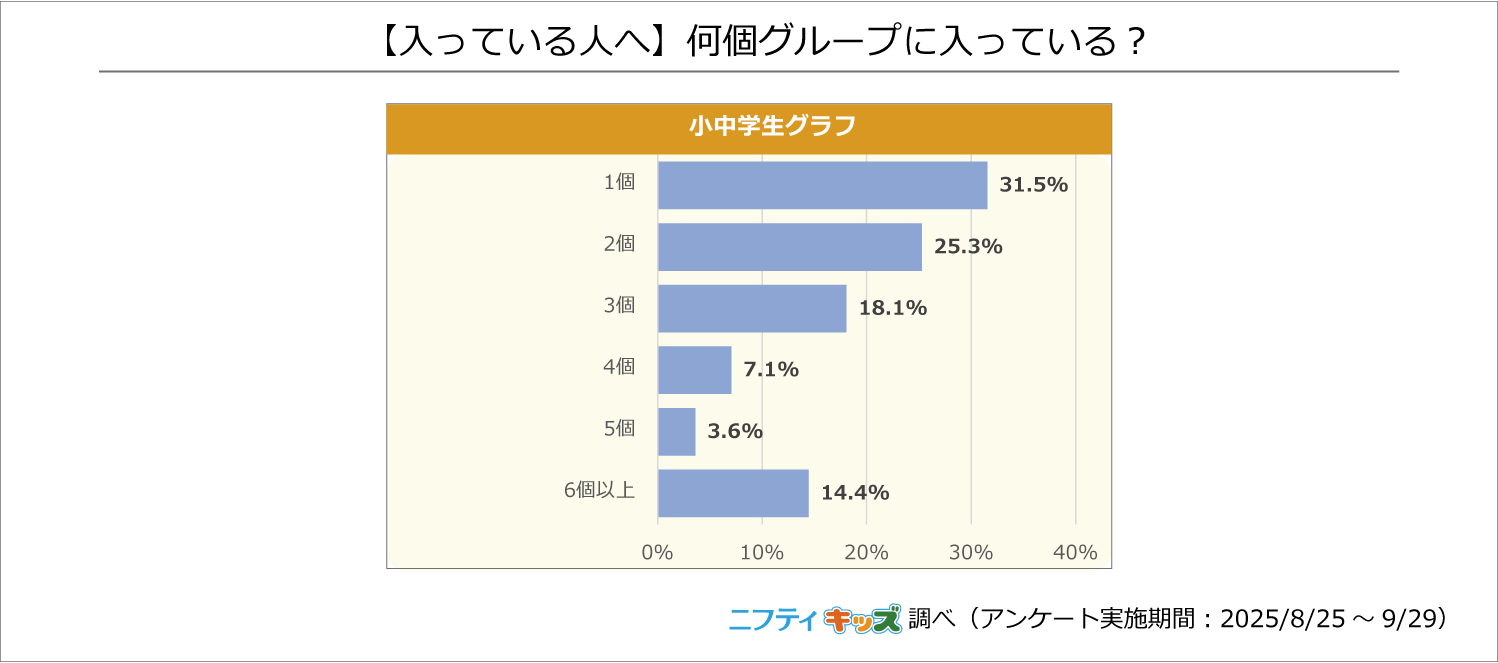 1つのグループのみに入っている人は31.5%で、「入っている」と回答した小中学生の約7割は複数のグループに所属していることがわかりました。中には、6つ以上のグループに入っている人もいました。